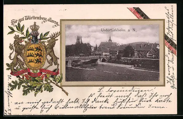 Passepartout-Lithographie Untertürkheim, Ortsansicht mit Neckarbrücke, Präge-Wappen mit Krone