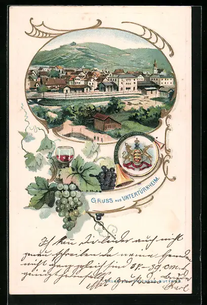 Passepartout-Lithographie Untertürkheim, Teilansicht mit Kirche, Wappen