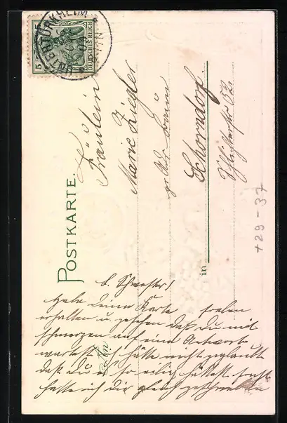 Personenbezogene Daten auf der Rückseite der Karte wurden durch blauen Textmarker unkenntlich gemacht. Die blauen Stellen sind auf die Vorderseite durchgeweicht und wirken sich negativ auf das Postkartenfoto aus