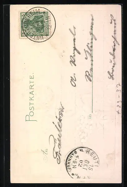 Personenbezogene Daten auf der Rückseite der Karte wurden durch blauen Textmarker unkenntlich gemacht. Die blauen Stellen sind auf die Vorderseite durchgeweicht und wirken sich negativ auf das Postkartenfoto aus