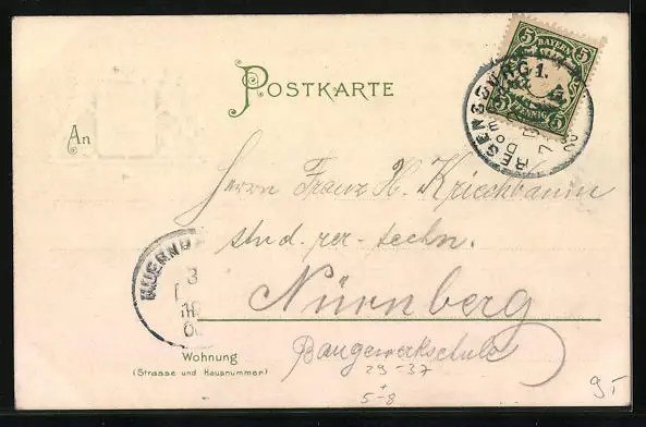 Personenbezogene Daten auf der Rückseite der Karte wurden durch blauen Textmarker unkenntlich gemacht. Die blauen Stellen sind auf die Vorderseite durchgeweicht und wirken sich negativ auf das Postkartenfoto aus
