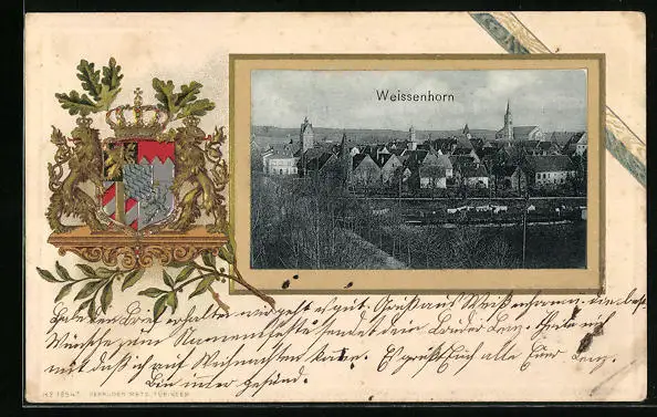 Passepartout-Lithographie Weissenhorn, Teilansicht, Wappen
