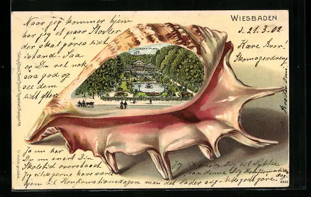 Passepartout-Lithographie Wiesbaden, Ansicht vom Kursaalplatz in einer Muschel