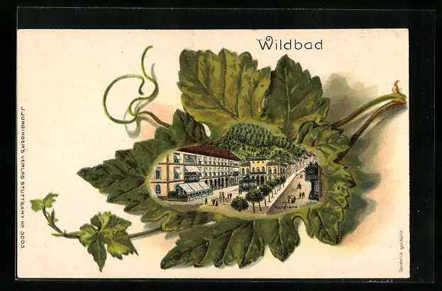 Passepartout-Lithographie Wildbad, Kurplatz mit Spaziergängern, Weinblatt