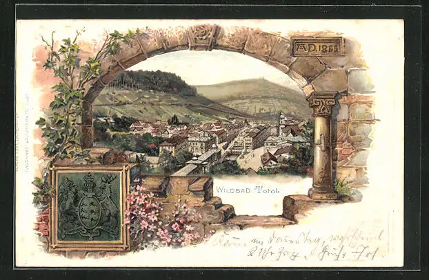 Passepartout-Lithographie Wildbad, Ortsansicht aus der Vogelschau, Wappen