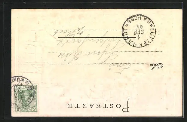 Personenbezogene Daten auf der Rückseite der Karte wurden durch blauen Textmarker unkenntlich gemacht. Die blauen Stellen sind auf die Vorderseite durchgeweicht und wirken sich negativ auf das Postkartenfoto aus