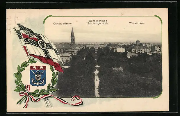 Passepartout-Lithographie Wilhelmshaven, Christuskirche, Stationsgebäude und Wasserturm, Wappen