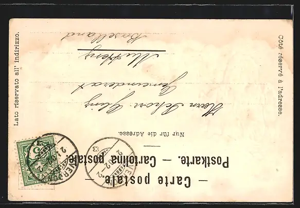 Personenbezogene Daten auf der Rückseite der Karte wurden durch blauen Textmarker unkenntlich gemacht. Die blauen Stellen sind auf die Vorderseite durchgeweicht und wirken sich negativ auf das Postkartenfoto aus