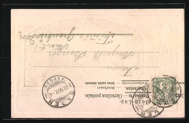 Personenbezogene Daten auf der Rückseite der Karte wurden durch blauen Textmarker unkenntlich gemacht. Die blauen Stellen sind auf die Vorderseite durchgeweicht und wirken sich negativ auf das Postkartenfoto aus