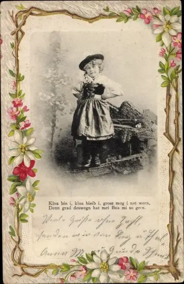 Passepartout Präge Ak Mädchen, kloa bin i, kloa bleib i, groß med i net wern