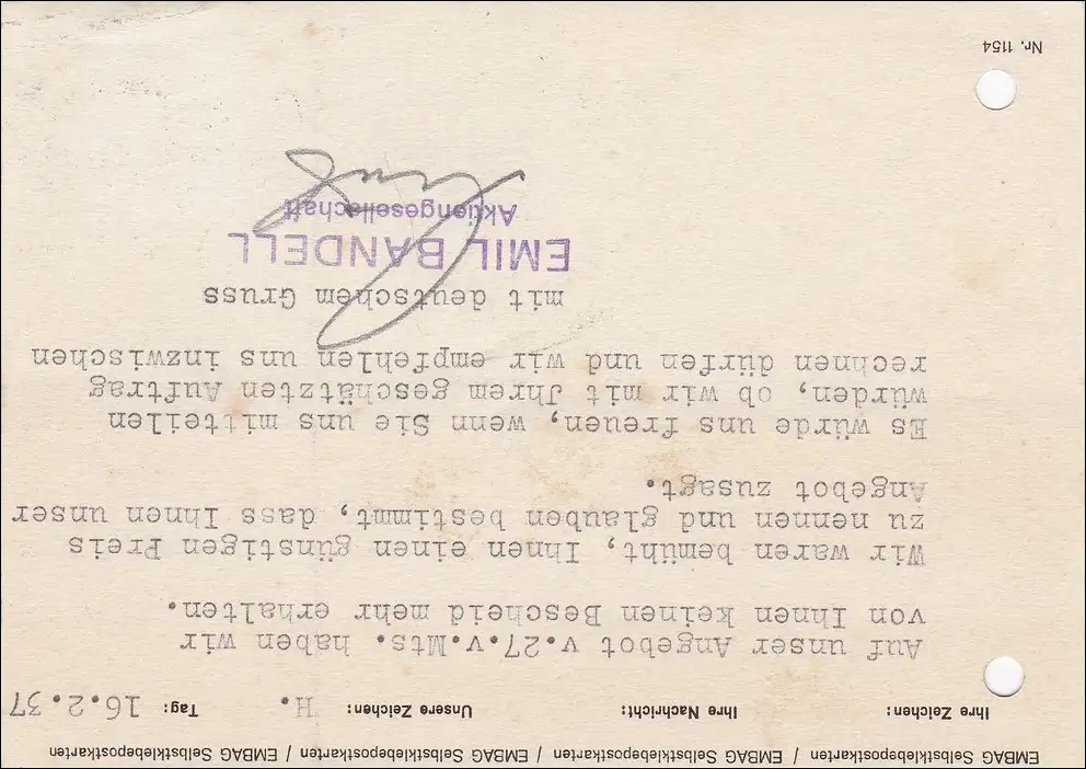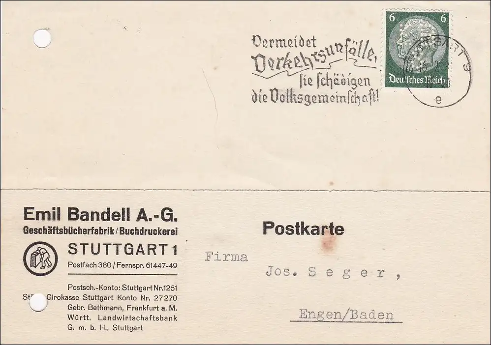 Perfin: Brief Stuttgart, Emil Ban dell, EB8, Werbestempel Verkehrsunfälle 1937