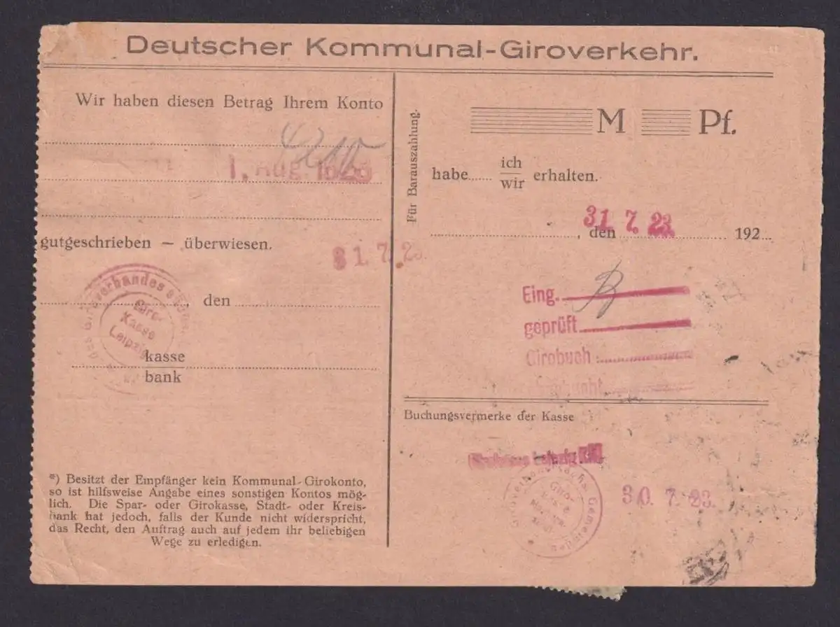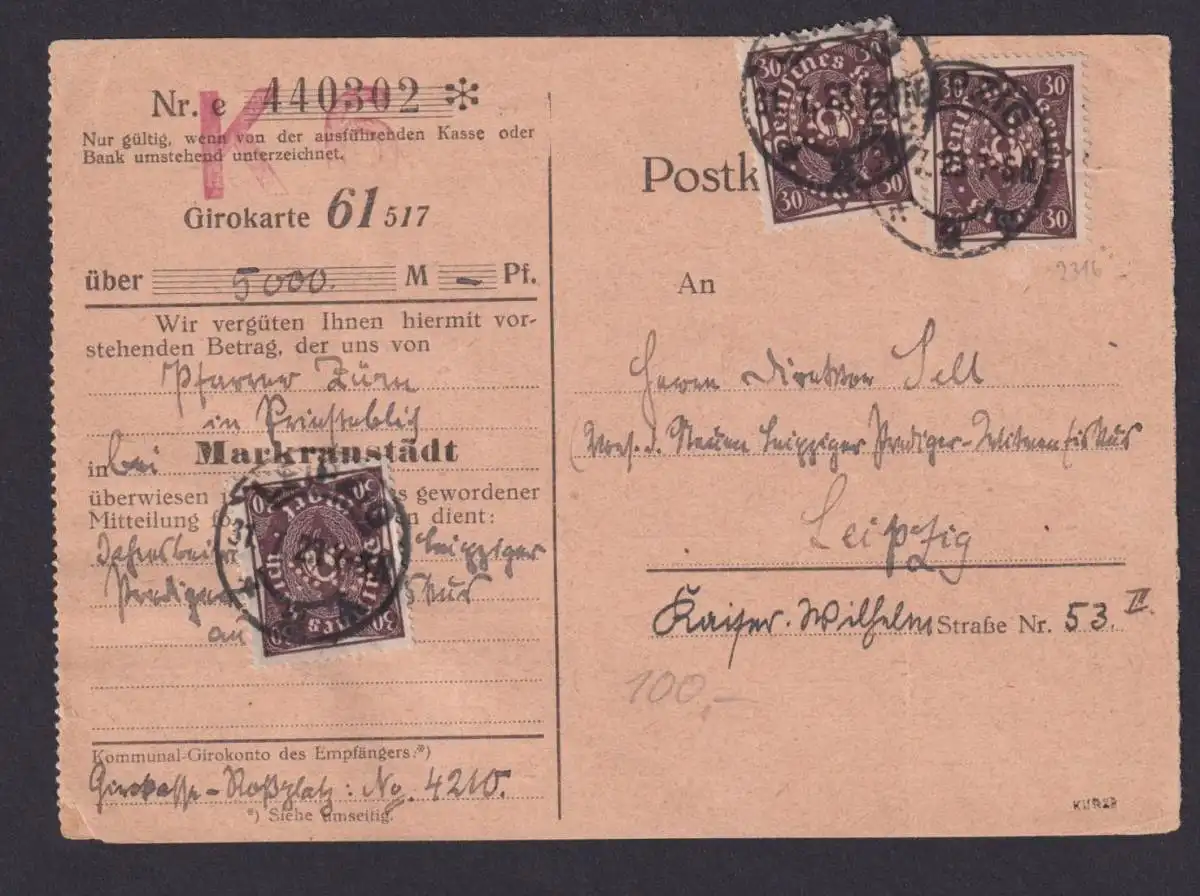 Perfin Privatlochung Leipzig GK Girokarte Infla MEF 30 Mark auf Postkarte
