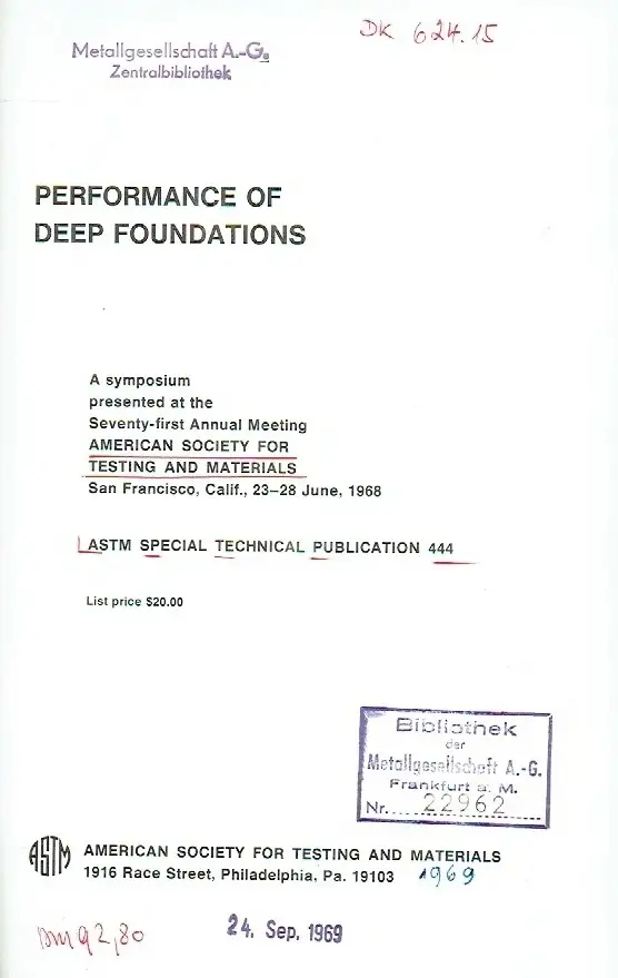 Performance of Deep Foundations A Symposium presented at the Seventy-first Annual Meeting American Society for Testing and Materials, San Francisco ... 1968.
