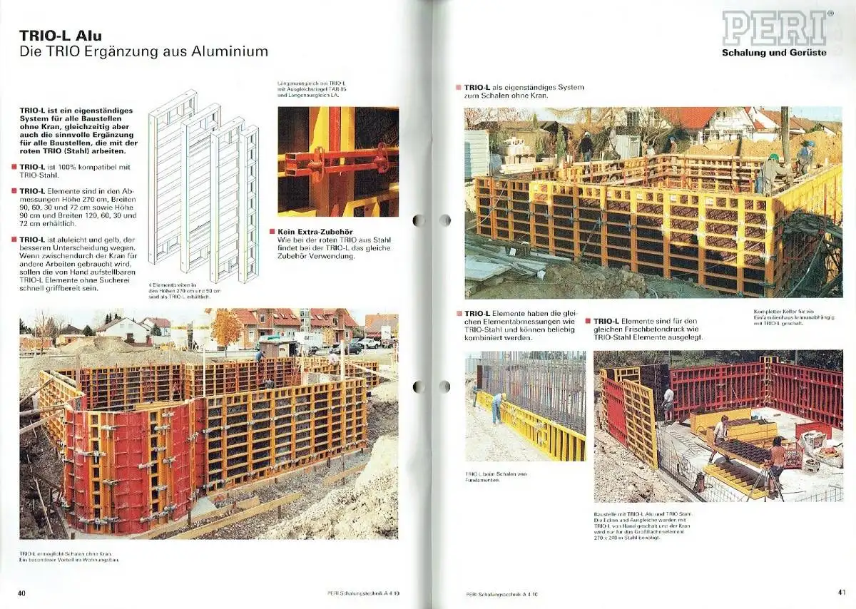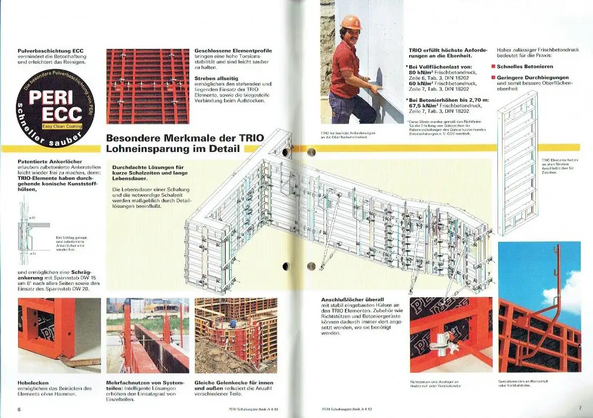 sehr guter Zustand, geringe Gebrauchs- und Alterungsspuren, Prospekt für Schalung und Gerüste - Wesentliches in Bildern - Europas erfolgreichste Rahmenschalung - Das Richtschloß BFD - Das Großflächenelement - Lohneinsparung im Detail - TRIO, die Eine für alles - PERI bietet mehr als nur die Schalung - Allgemeine Anwendungen - ELPOS, RUMBA, CAD-Makros - Standardlösungen - Pflege, Reinigung und Wartung Transport und Lagerung - Sicherheit von Anfang an - Sicherheit beim Betonieren - Spezielle Anwendungen - Fundamente - Einhäuptige Wände - Schächte - Hohe Wände - Runde Bauwerke - Kletterschalung - Sondereinsätze - TRIO Ergänzungen - TRIO-L Alu - TRIO 330 - TRIO Struktur - TRIO Säulenschalung - Programmteil - PERI in Deutschland - PERI International, kartoniert, ca. 21 x 29,5, 77 Seiten mit zahlreichen Bildern
