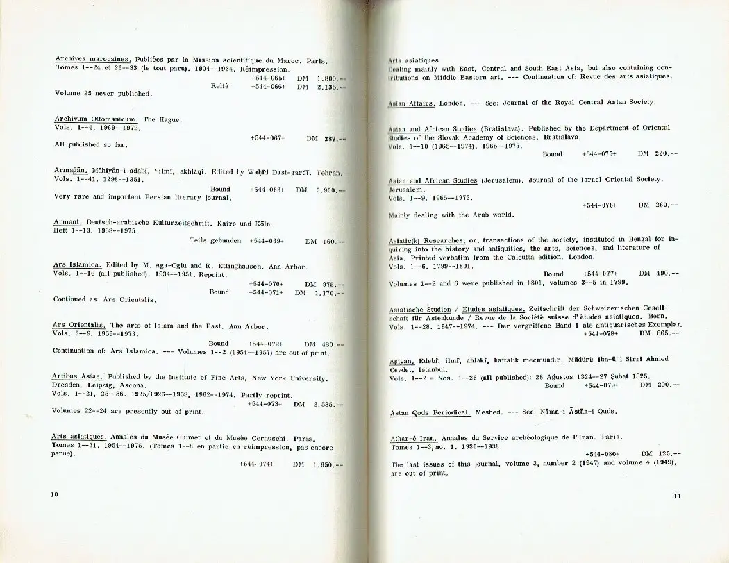 sehr guter Zustand, geringe Gebrauchs- und Alterungsspuren: Umschlag und Seiten teils etwas eselsohrig, alter Antiquariats-Katalog von Zeitschriften und Serien zum Thema Naher und Mittlerer Osten überwiegend in englischer Sprache, kartoniert, ca. 14 x 21, 88 Seiten