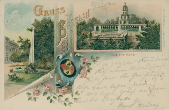 Perl Wappen Litho Wrocław Breslau in Schlesien, Liebichshöhe, Springbrunnen