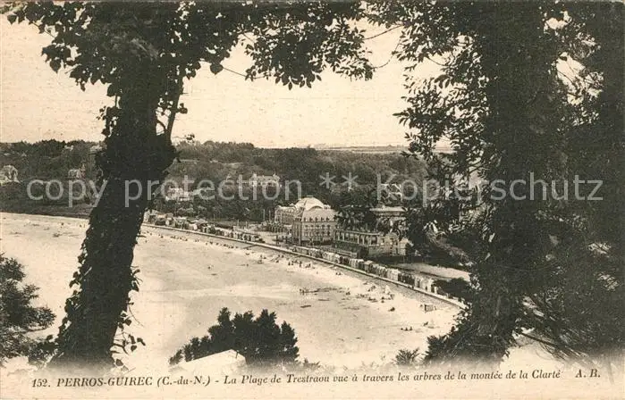 Perros-Guirec La Plage de Trestraou vue a travers les arbres de la montee de la Clarte Perros-Guirec postalisch gelaufen 1921-1965 Erhaltung siehe scans [WerneD78] WernPID7