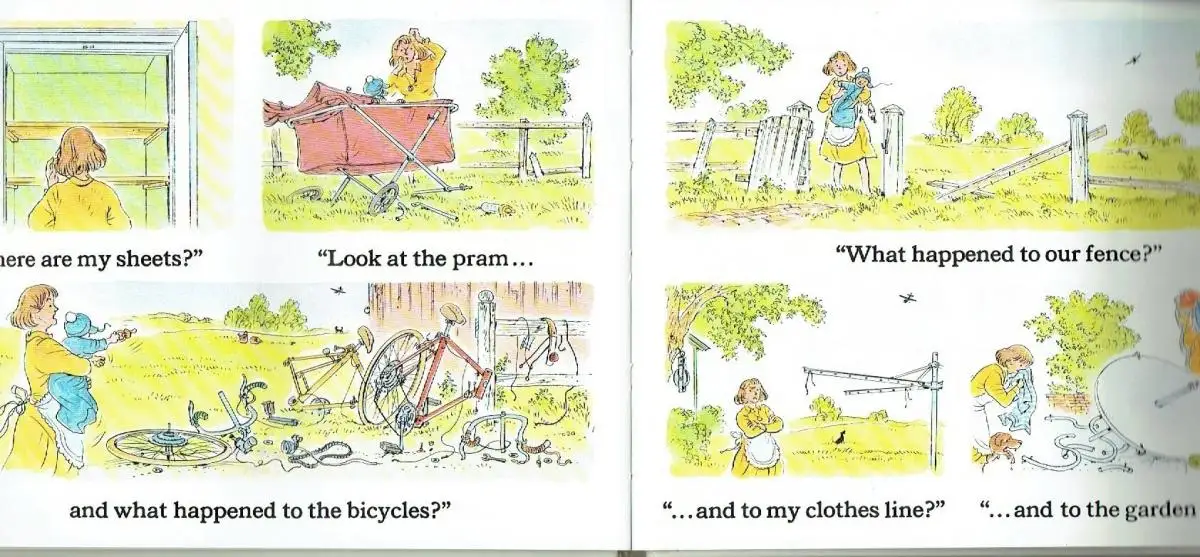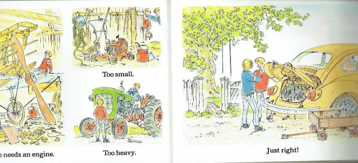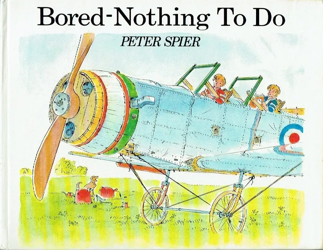 guter bis sehr guter Zustand, geringe Gebrauchs- und Alterungsspuren: Seiten sauber und ordentlich - obere Einbandecken etwas gequetscht - Einband an der senkrechten Kante vergilbt, liebevoll-skurril illustriertes Kinderbuch über 2 Jungen, die sich aus purer Langeweile ein Flugzeug bauen, dazu wird aus Papas Auto der Motor ausgebaut, der Fernseher zerlegt und viele weitere Sachen aus Haus und Garten zweckentfremdet, Hardcover, ca. 26,5 x 20,5, 46 Seiten mit zahlreichen Bildern