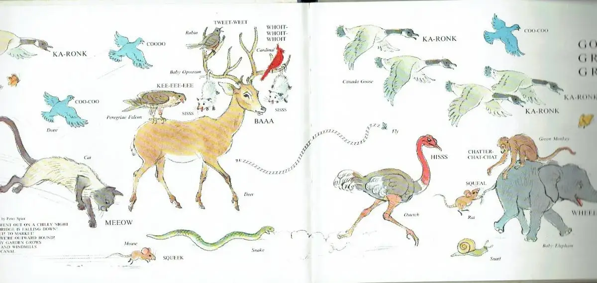 guter Zustand, geringe Gebrauchs- und Alterungsspuren: Einband teils etwas abgenutzt und gering verschmutzt - Einbandecken gering defekt - Seiten sauber und ordentlich - 3-4 minimale Eselsohren, liebevoll-skurril illustriertes Kinderbuch über Tiere und deren Stimmen / Geräusche, Hardcover, ca. 26,5 x 20,5, 44 Seiten mit zahlreichen Bildern