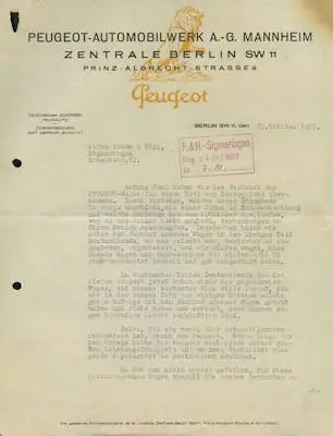 2 Seiten DinA4 Peugeot-Automobil-Werk AG, Mannheim, Zentrale Berlin SW 11, Vertriebsfirma für Peugeot ab 1927 in Deutschland Leichte Gebrauchsspuren, gelocht