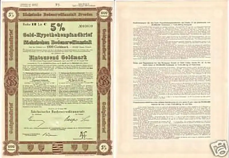 5 % Gold-Hypothekenpfandbrief der Sächsischen Bodencreditanstalt über 1000 Goldmark Dresden, den 31. Januar 1927 Format: A4 gute Erhaltung, siehe Bild