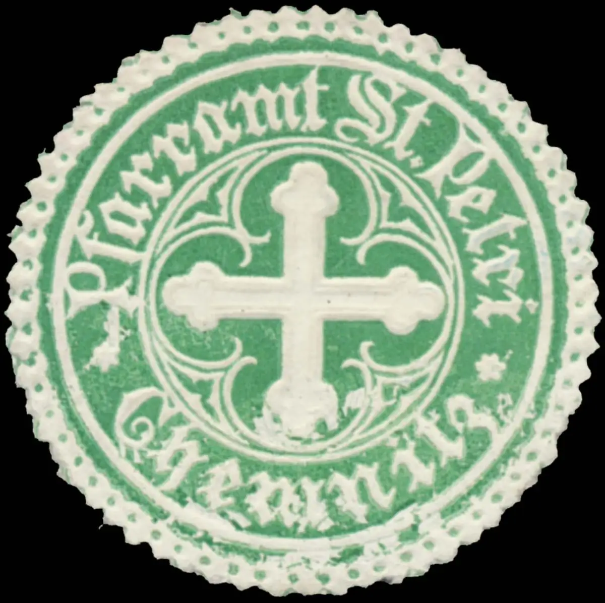 Kirche, Religion, grün, weiß, geprägt, Größe/Zustand: 4 , leicht beschädigt, Original Verschluss-Siegelmarke aus Papier welche früher von Behörden, Firmen etc. zum Versiegeln der Briefe benutzt wurden