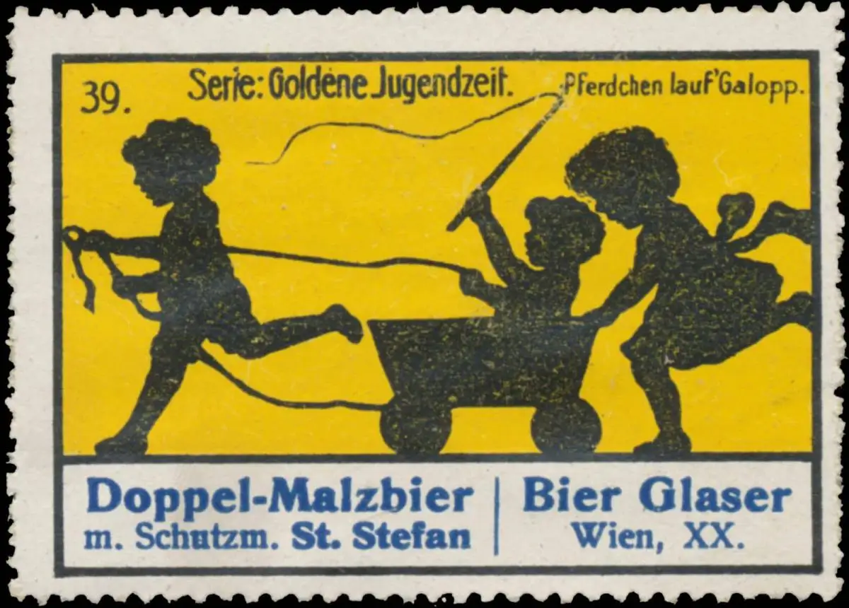 Doppel-Malzbier mit Schutzmarke St. Stefan, Serie: Goldene Jugendzeit, Kinder, Bild 39 , Größe/Zustand: 4x6 , guter Zustand, Original alte Reklamemarke die seinerzeit für die Werbung benutzt wurde