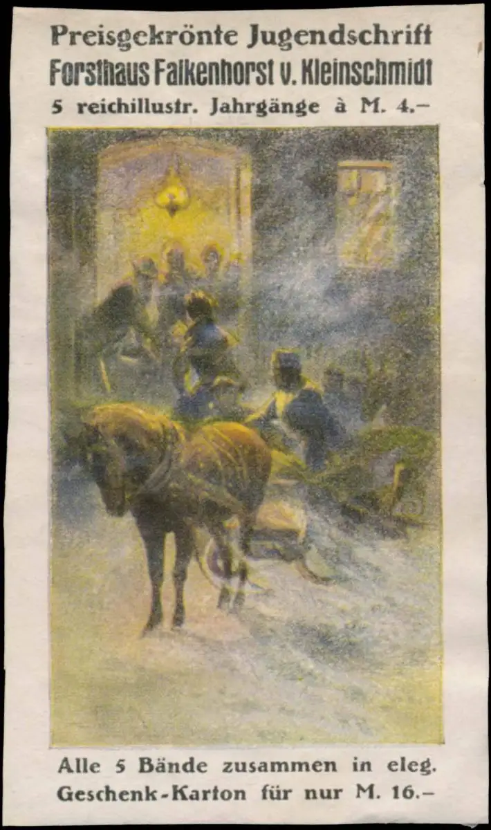 Forsthaus Falkenhorst v. Kleinschmidt, Preisgekrönte Jugendschrift, Jagd, Größe/Zustand: 8x4 , beschnitten, Rückseite fleckig sonst guter Zustand, Original alte Reklamemarke die seinerzeit für die Werbung benutzt wurde