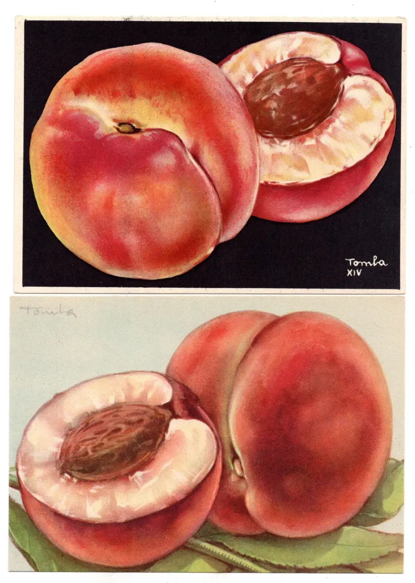 Pfirsichausstellung - Zwei Postkarten - Pfirsichausstellung - Zwei Postkarten gezeichnet von E. Ausstellungsgrab 1936 und 38 - neu in sehr gutem Erhaltungszustand - Ungewöhnlich für Themensammlungen Nr. 135/20