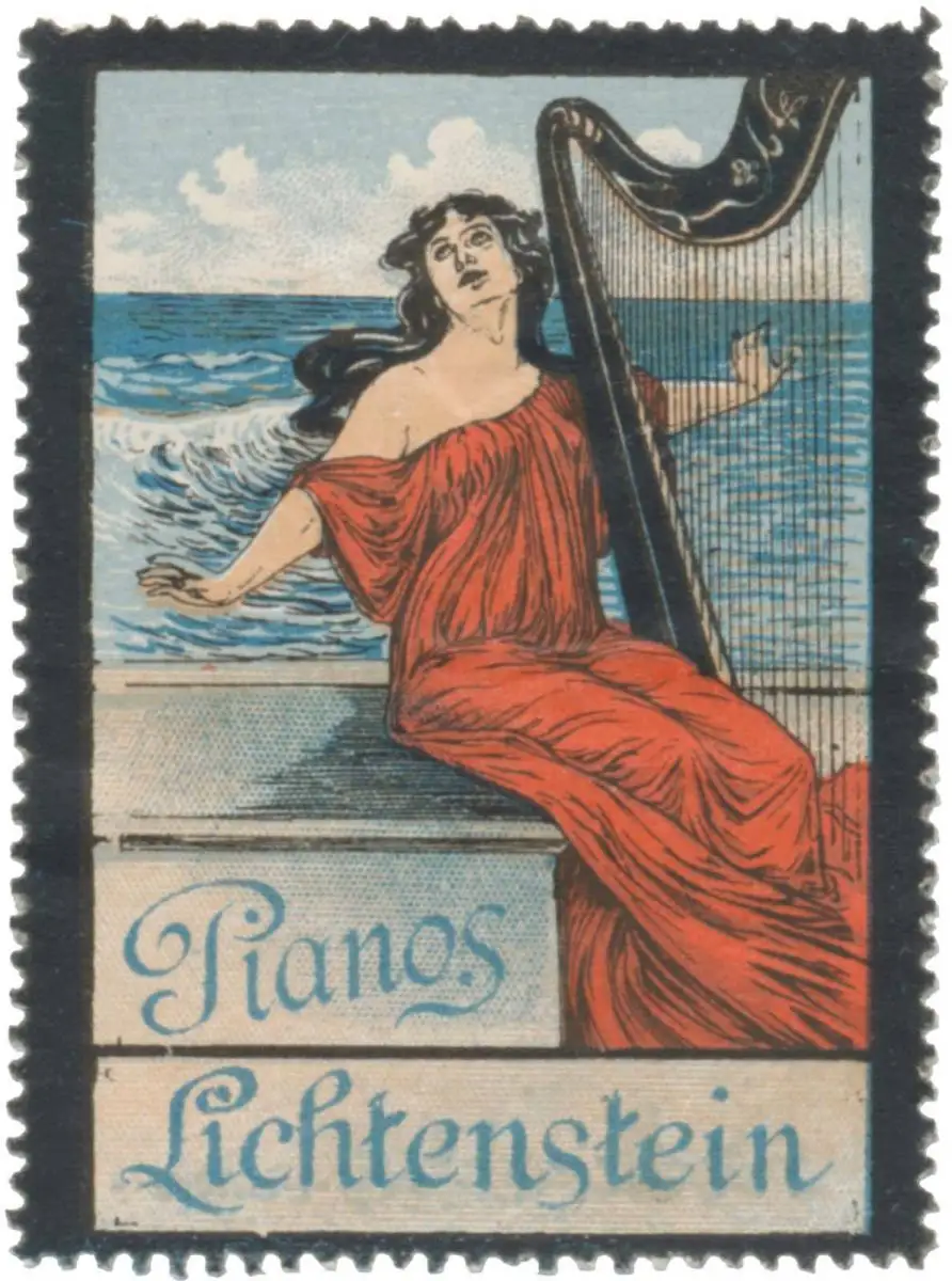 Klavier, Harfe, Größe/Zustand: 6x4 , guter Zustand, Original alte Reklamemarke die seinerzeit für die Werbung benutzt wurde