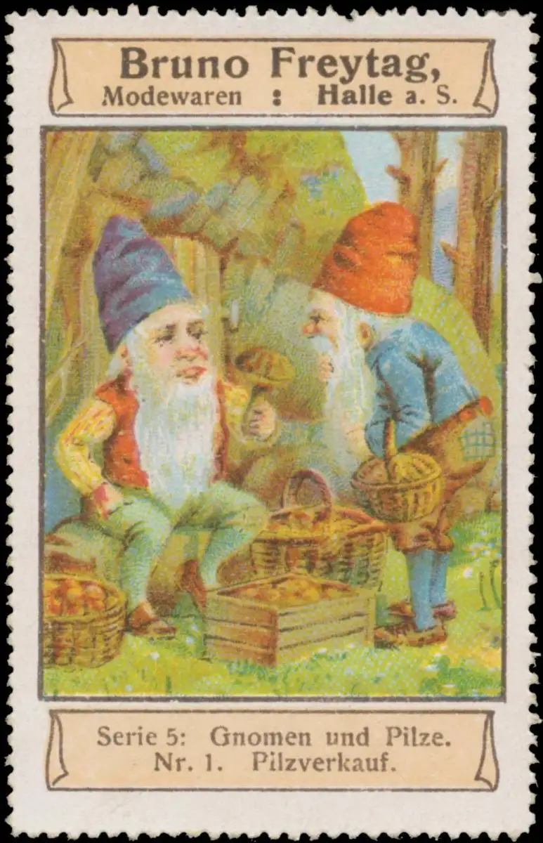 Serie 5: Gnomen und Pilze, Nr. 1 Pilzverkauf, Zwerge, Größe/Zustand: 7x5 , guter Zustand, Original alte Reklamemarke die seinerzeit für die Werbung benutzt wurde