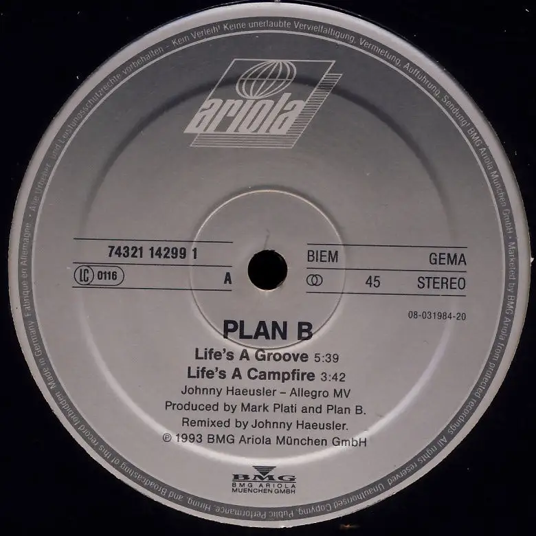 12" Maxi Plan B - Life's A Beat The Re-Mixes, Promo, Einheitscover der Plattenfirma mit Info-Aufkleber, Zustand Platte M- Hülle M-; Made in Germany 1993 Ariola 74321 14299 1, Tracks Life's A Groove, Life's A Campfire, Life's A Bassline, Life's An Instrumental