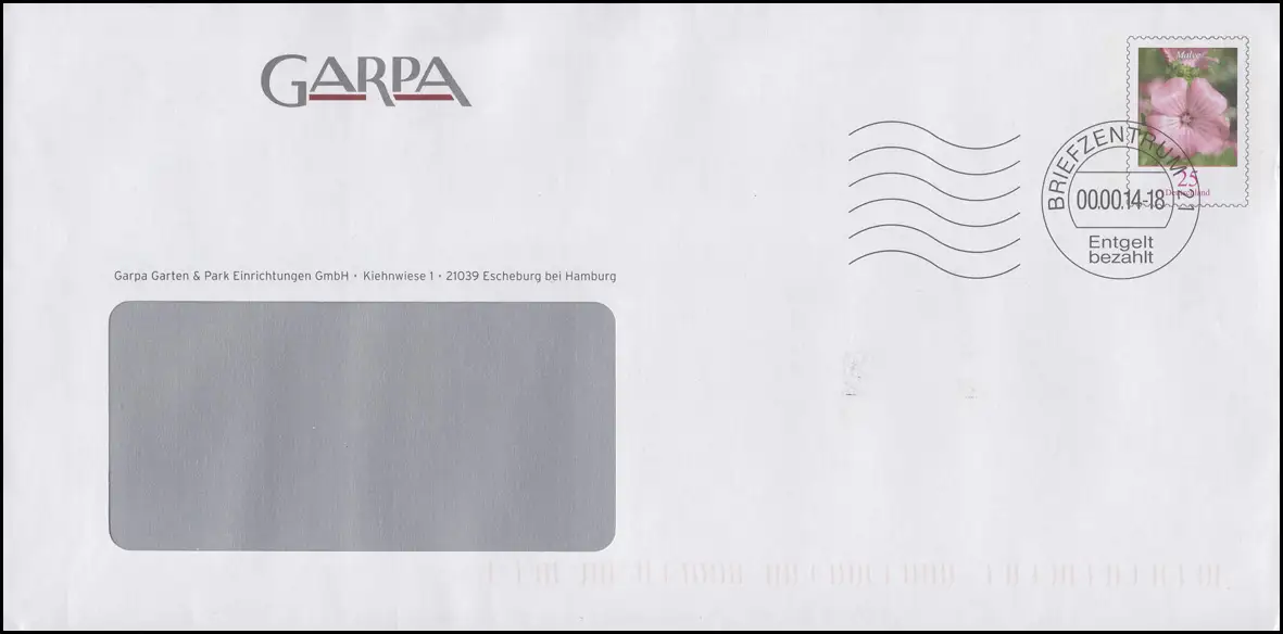 Plusbrief Blume Malve 25 Cent GARPA Escheburg, Briefzentrum 21 - 2014, codiert
