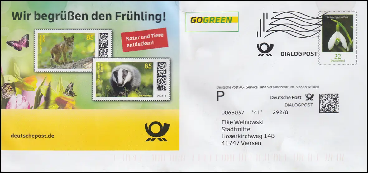 Plusbrief Dialogpost Schneeglöckchen Frühling Tierkinder Luchs Dachs, 2022
