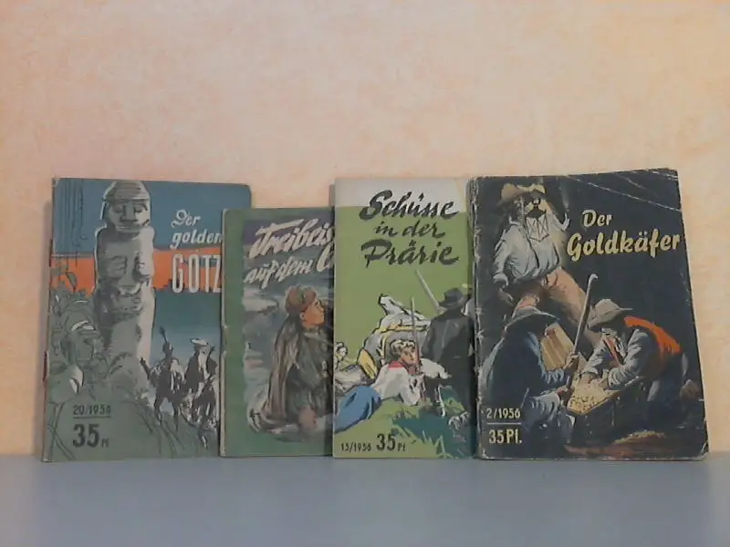 alle 4 Heftchen stammen daus einer Haushaltsauflösung, gebräunt, fleckig, Einbandkanten mit Bestoßungen, stärkere Gebrauchsspuren, Der Goldkäfer (Kleine Jugendreihe Nr. 2 / 1956) + Schüsse in der Prärie, Kleine Jugendreihe Nr.15/1956 + Treibeis auf dem Chan (Kleine Jugendreihe Nr. 34Der goldene Götze (Kleine Jugendreihe Nr. 20/1956) / 1956) + Beschreibung vom Antiquariat Ardelt 1k5b Antiquariat Ardelt