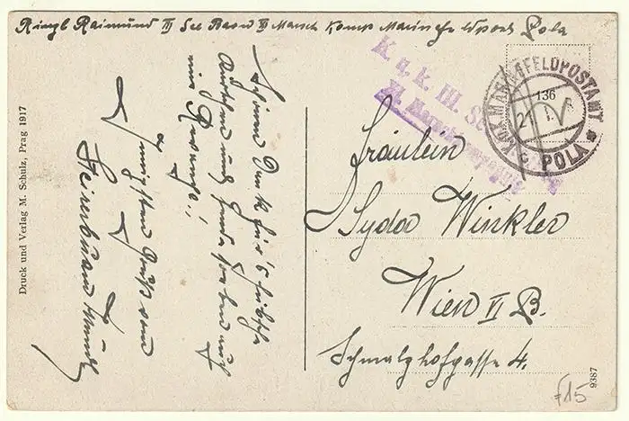 Bemerkungen: Gelaufen mit Stempel. Zweizeiler violett - neben K. u. K.MFPA/21 .1.18/cPola.
