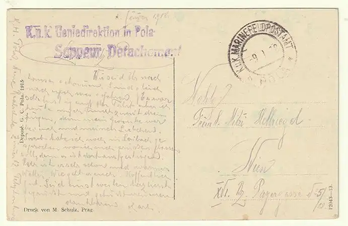 Bemerkungen: Gelaufen mit Stempel. Zweizeiler violett neben K. u .K. MFPA/9. 1. 18/Pola.