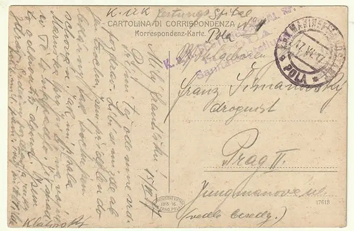 Bemerkungen: Gelaufen mit Stempel..Dreizeiler violett neben K.u.K.MFPA/17. VI. 17/aPola/aufAkPola.
