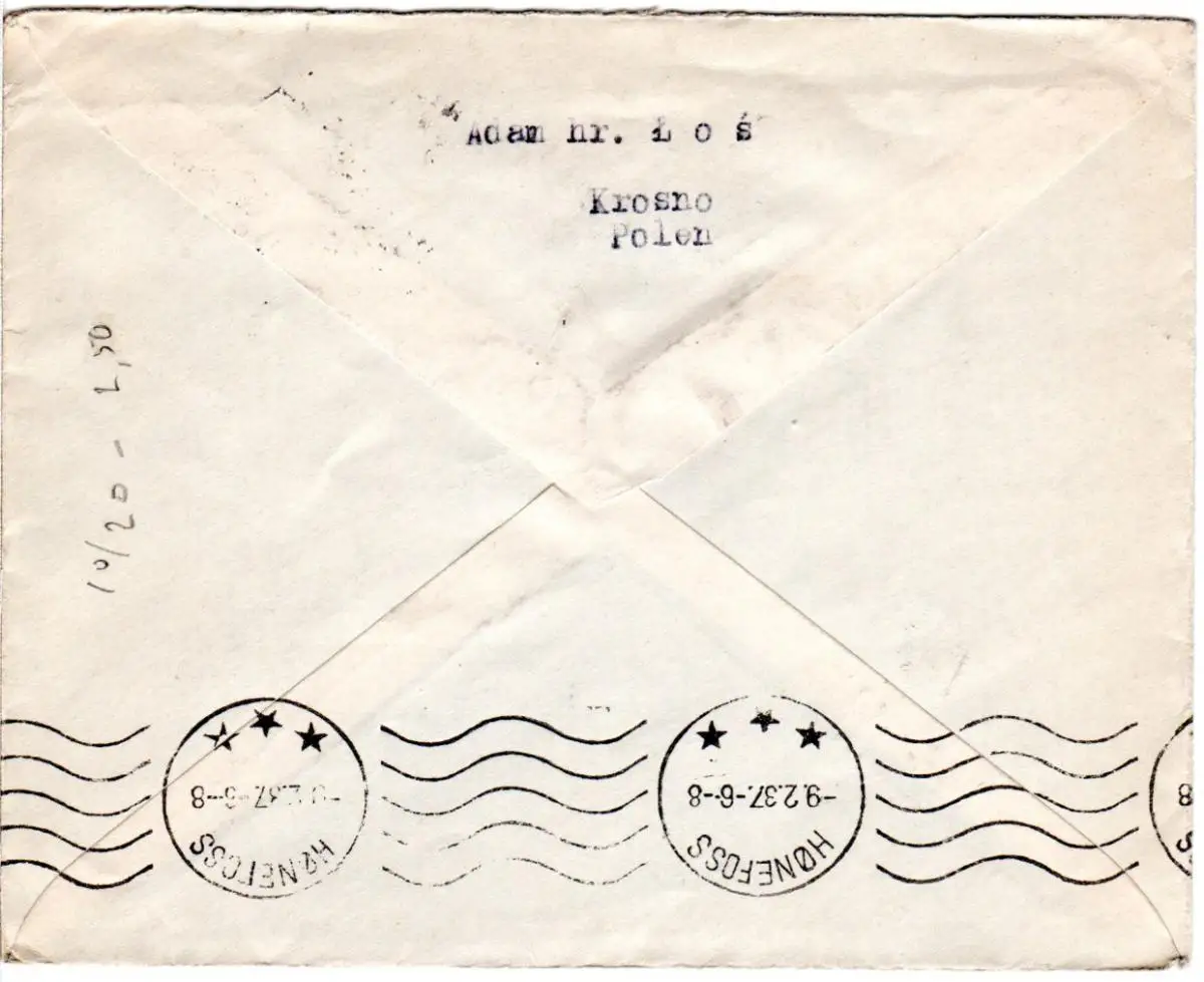 Polen 1937, 5+2x25 Gr. auf Brief v. Krosno n. Norwegen
