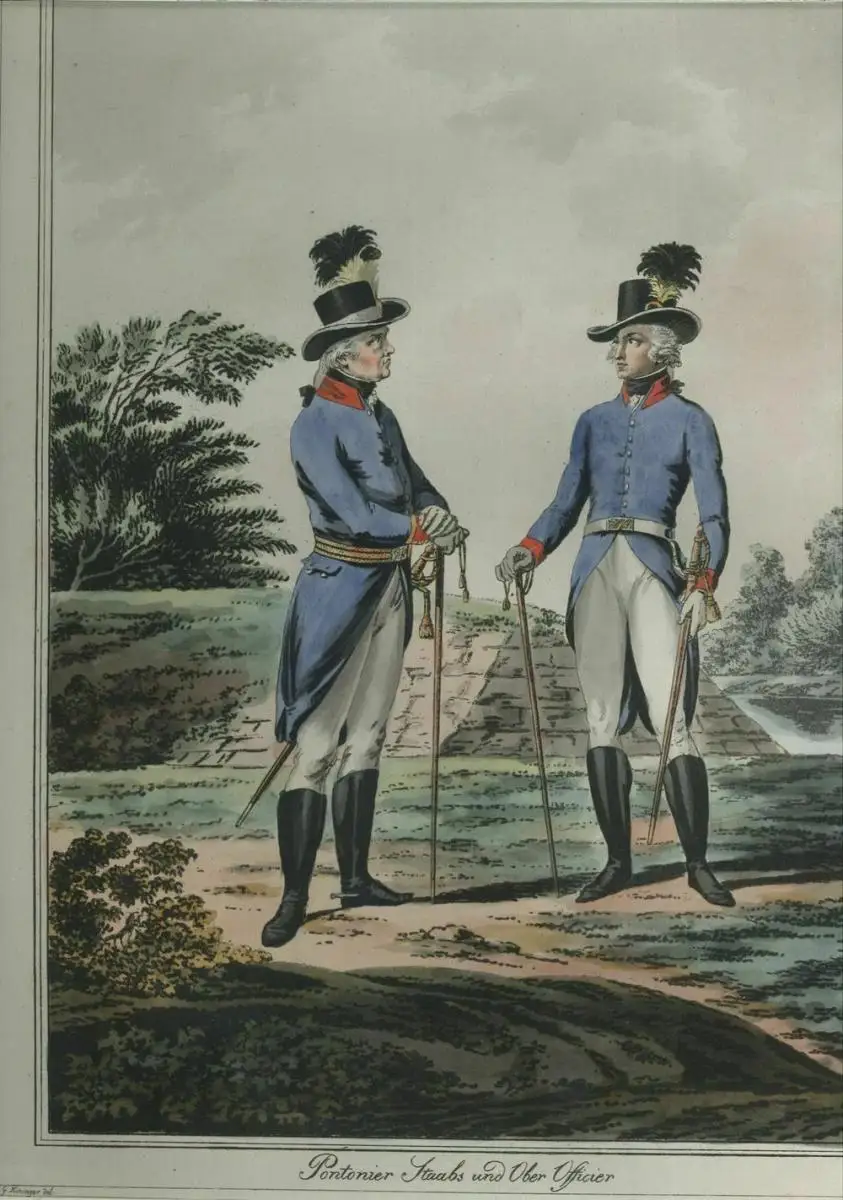 Wien, Mollo 1796-98. Altkolor. Kupferstich aus "Abbildungen der neuen Adjustierung der K. K. Armee, gest. v. J. E. Mansfeld nach einer Vorlage v. V. G. Kininger, 50 x 38 (Blattgr.); 43 x 31, 5 cm. (Bildausschn.). Unter Passep., gerahmt. In sehr gutem Zustand.