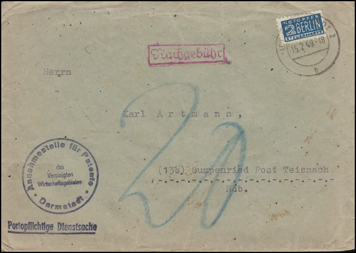 Portopflichtige Dienstsache Annahmestelle für Patente in DARMSTADT 15.2.49
