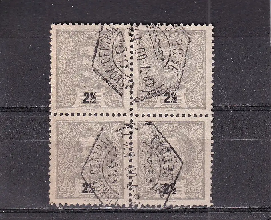 PORTUGAL 1895 D. CARLOS 2 1/2 R/ Mi 124 BLOCK OF 4 VERY FINE USED/GESEMPELT/USADO