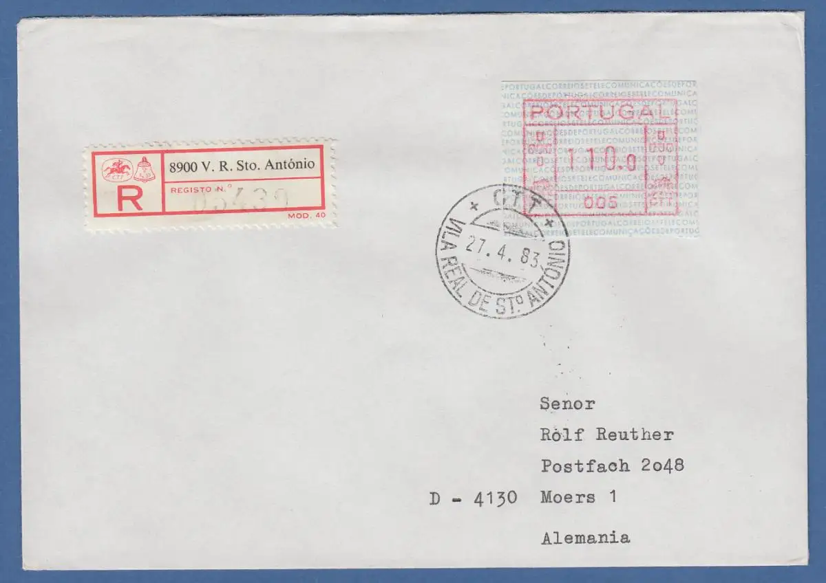 Portugal Frama-ATM 1981, ATM 005 aus OA auf R-Brief Vila Real, 27.4.83