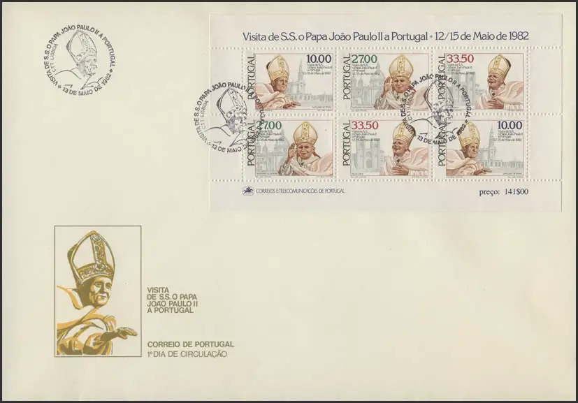 Portugal: Papst Paul II. zu Besuch in Portugal 1982, Block auf Schmuck-FDC