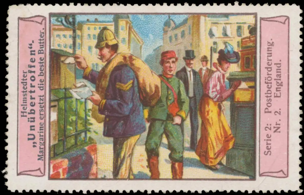 Serie 2: Postbeförderung, Nr. 2, Helmstedter "Unübertroffen" Margarine ersetzt die beste Butter, Größe/Zustand: 5x7 , guter Zustand, Original alte Reklamemarke die seinerzeit für die Werbung benutzt wurde