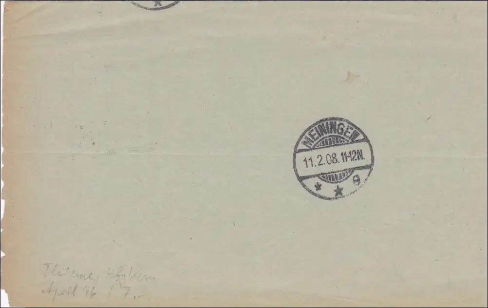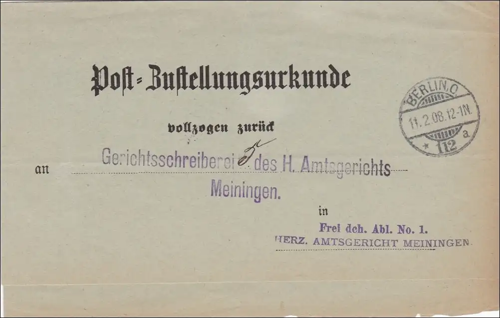 Post Zustellurkunde Berlin nach Meiningen 1908