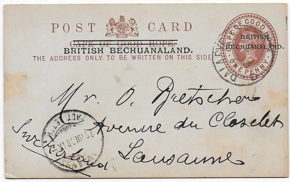 Post card British Bechuanaland to Lausanne/CH, 1900