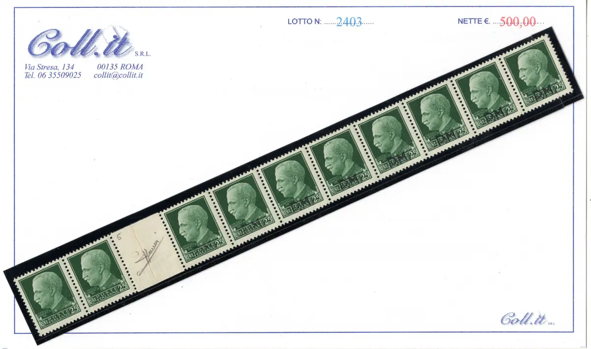 MNH - VOLLGUMMI - Imperiale Cent. 25 Aufdruck P.M. Nr. 5. horizontaler Zehnstreifen mit Gruppenabstand, in dem die ersten vier Exemplare aus dem rechten Jahr fast normal überdruckt sind, die nächsten drei mehr oder weniger verblassenden Aufdruck haben und die letzten drei, am Ende des Zwischenraums, völlig leer sind - Der Streifen, einer von zehn bekannten, ist perfekt mit Vollgummi - Selten - Sorani Zertifikat Katalog euro3750 Cod.2403/WEB