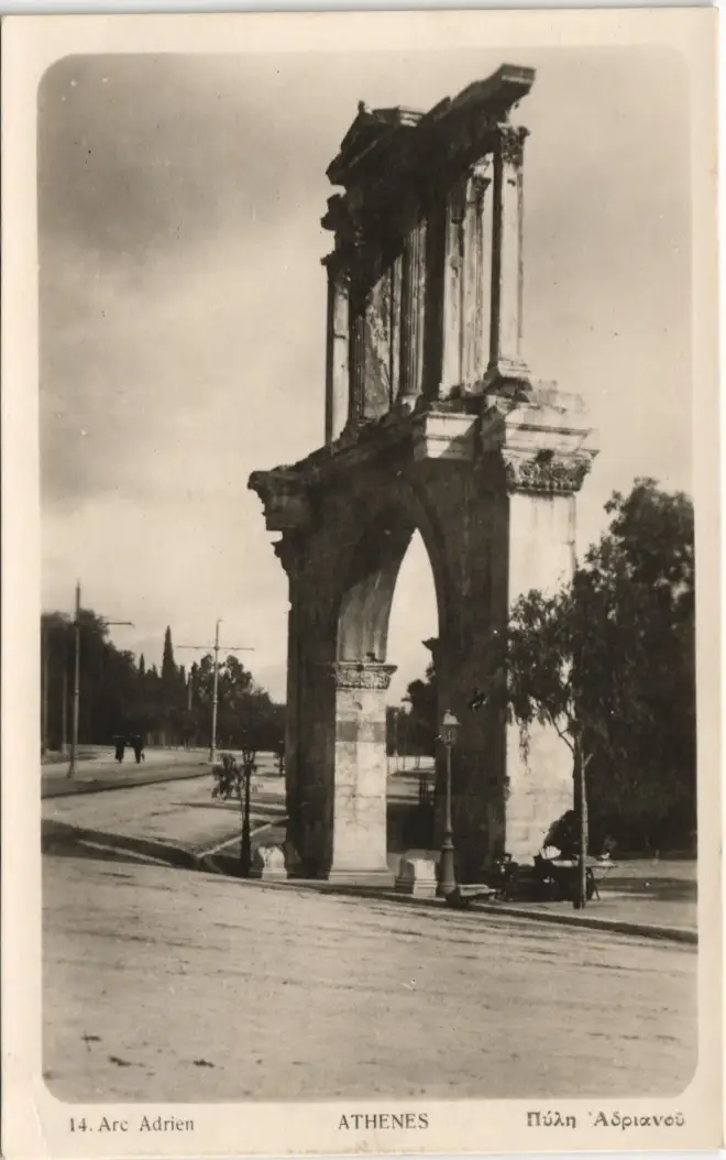 Postcard Athen Αθήνα Strassen Partie am Arc Adrien 1930