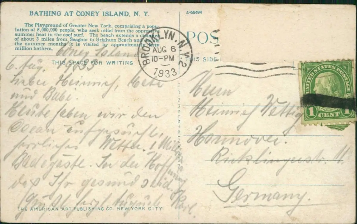 Postcard Brooklyn Bathing at Coney Island, N. Y. 1933